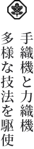 西陣岡本では求められる製品に応じて手織機と力織機を使い分け、熟練の技法を駆使して絹の色艶、金銀の煌めきを際立てる絹織物を織り上げます。