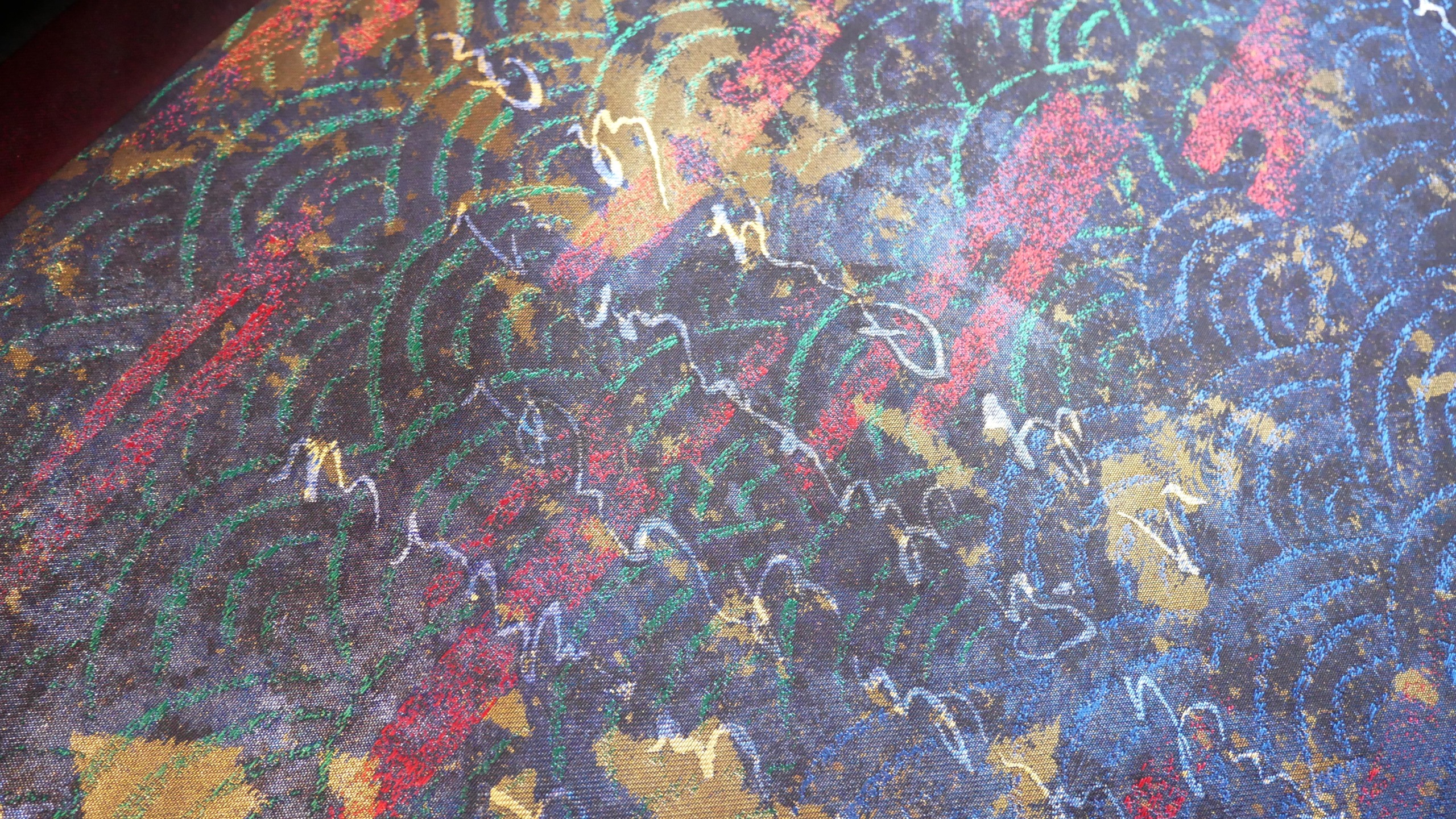 箔糸を装置付きのシャットル力織機で織り込む際は、「順引き」と呼ばれる織り方で柄がずれないよう一本ずつ丁寧に入れていきます。織りの緊張感が仕上がりに大きく影響します。