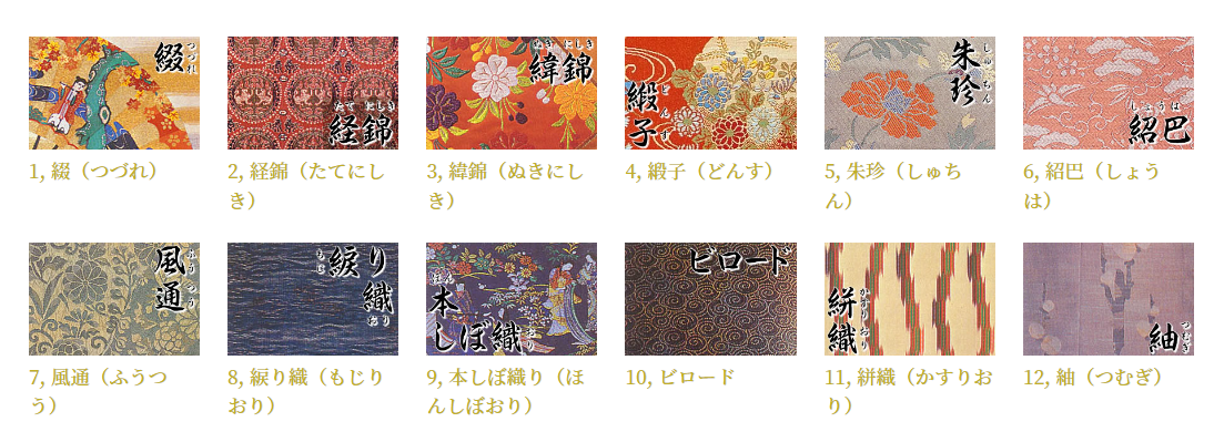 西陣織工業組合によると西陣織の定義として12種類の技法が認められ、様々な織物が西陣で製織可能なことがわかります。
