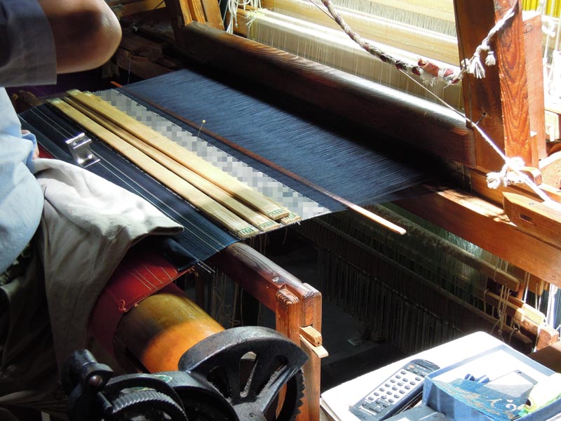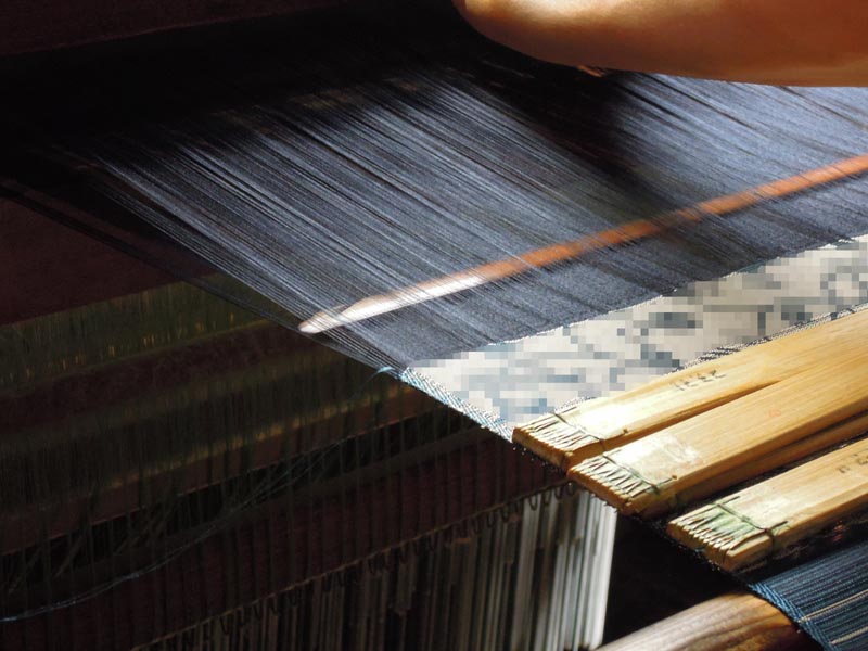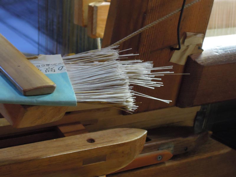 引箔糸は絹糸のように杼(シャトル)に巻くことはできないため、箔糸は手で丁寧に引き入れます。