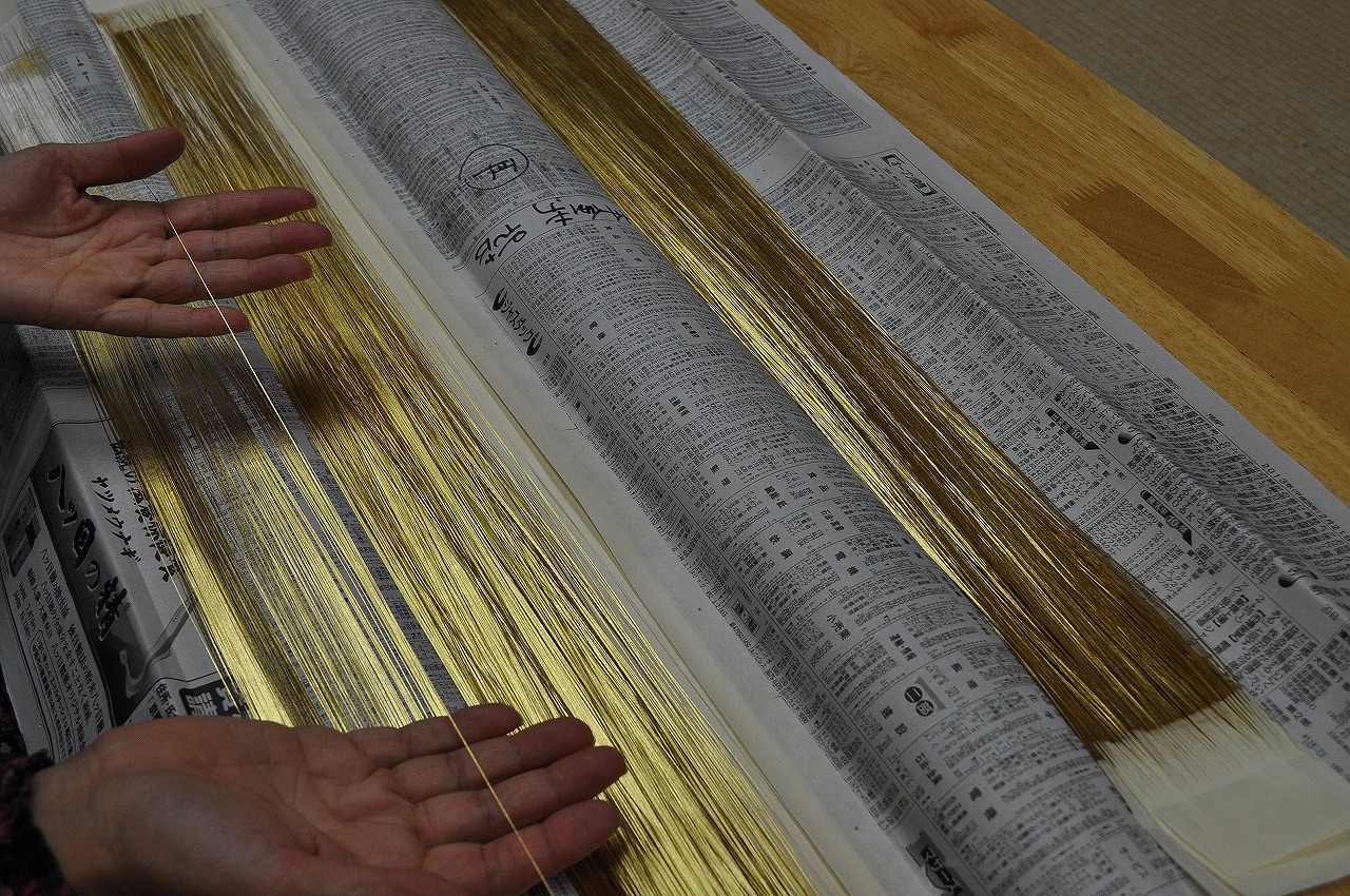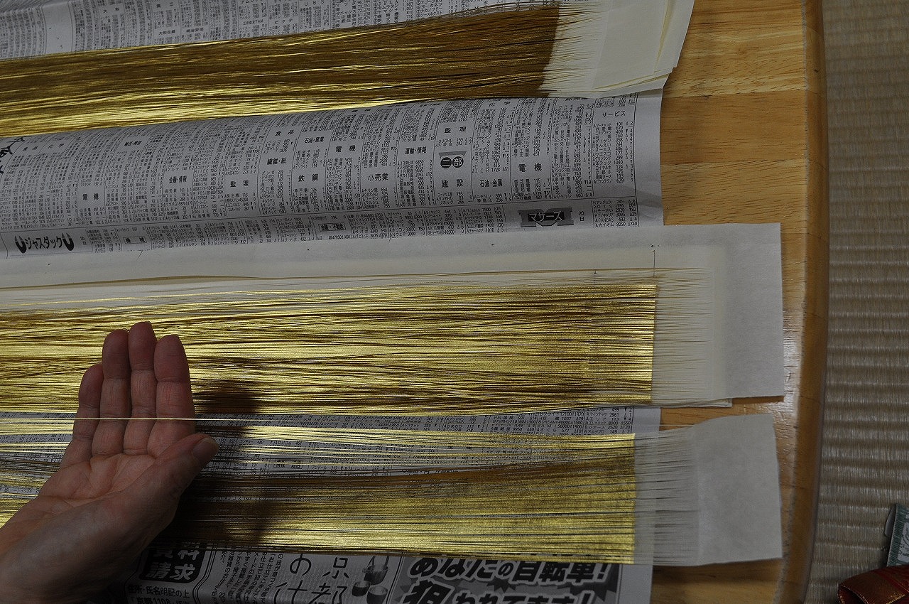 こちらの写真は、私たちが使っている「金沢産本金箔使用の漆和紙箔糸」です。和紙に金箔を漆で貼り、細く細く切った糸、それが箔糸です。
