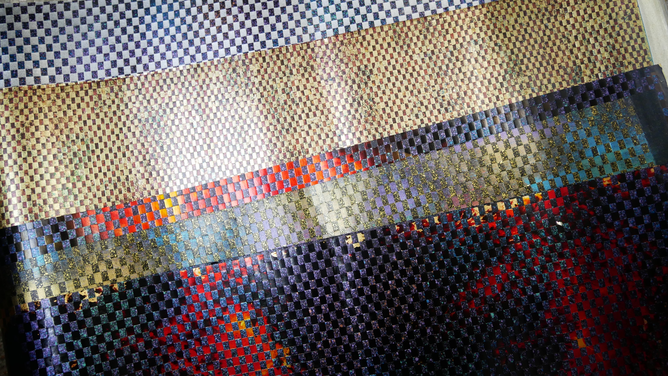 この写真は筆者が感動した模様引箔です。2枚の模様引箔を作り、それを裁断して、網代に編みます。それを更に裁断し、糸として使います。これは、1枚の紙としてもとても面白く、織り込むのがもったいないなと感じたくらいです。