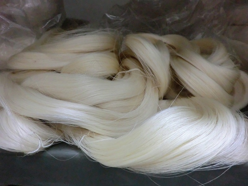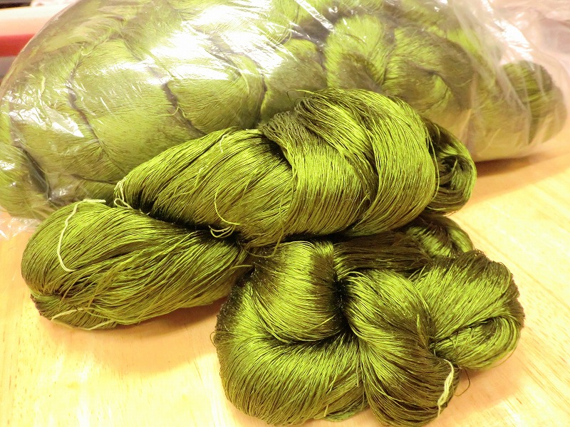 絹糸は繭から取り出したばかりの時はセリシンが残っているため、張りがあり硬いです。精錬が終わった糸はしっとりしますが、染める前の生糸は張りがあります。