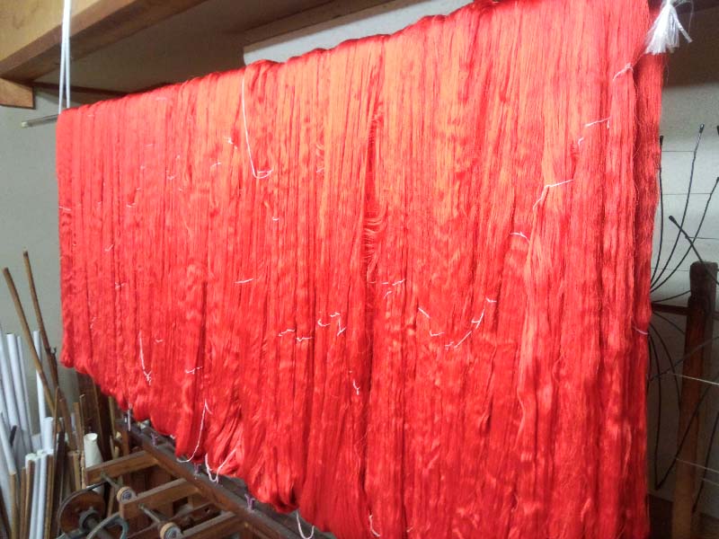 染屋さんから染めあがって帰ってきた赤い絹糸。
