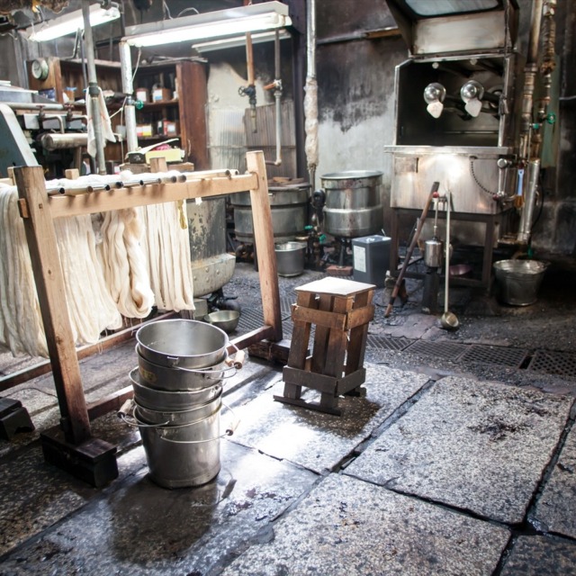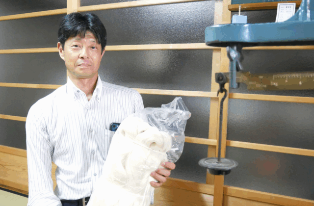 Toshiyuki’s grandfather was born in 1898 (Meiji 31). As a young man, he apprenticed at a starching shop and learned the craft. It was a time of transition from handlooms to power looms. While handlooms applied starch during weaving, power looms required starching after the fabric was woven. As power looms became more common, so too did the need for “hari-ya.”