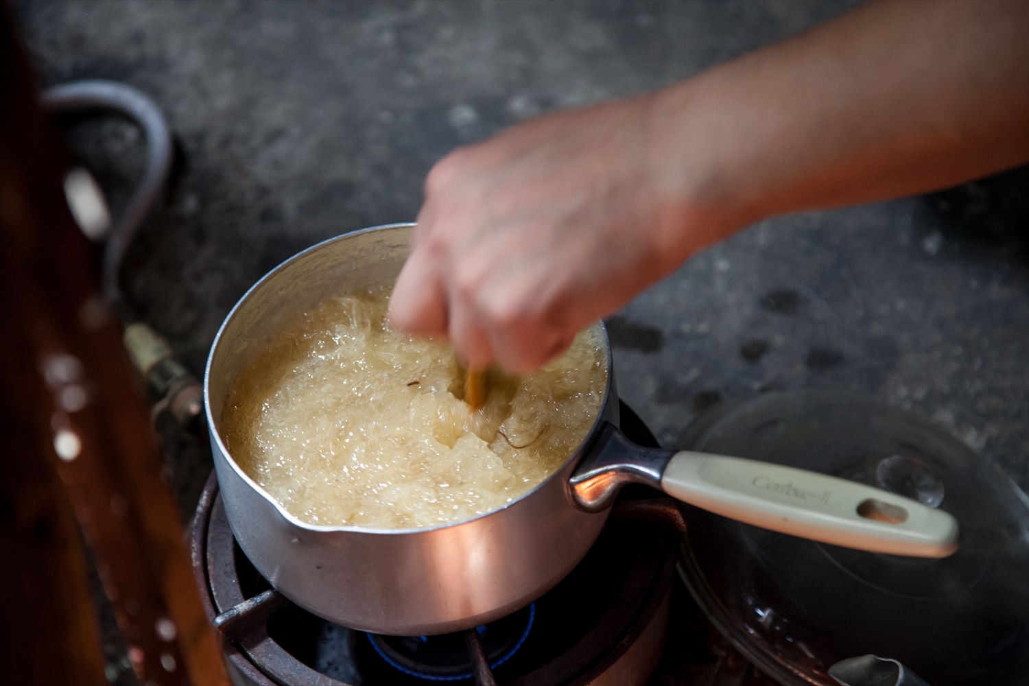The photos show, from left to right: sheet funori, simmering funori, and kneading the paste. Photo: Socca Co., Ltd. 2017