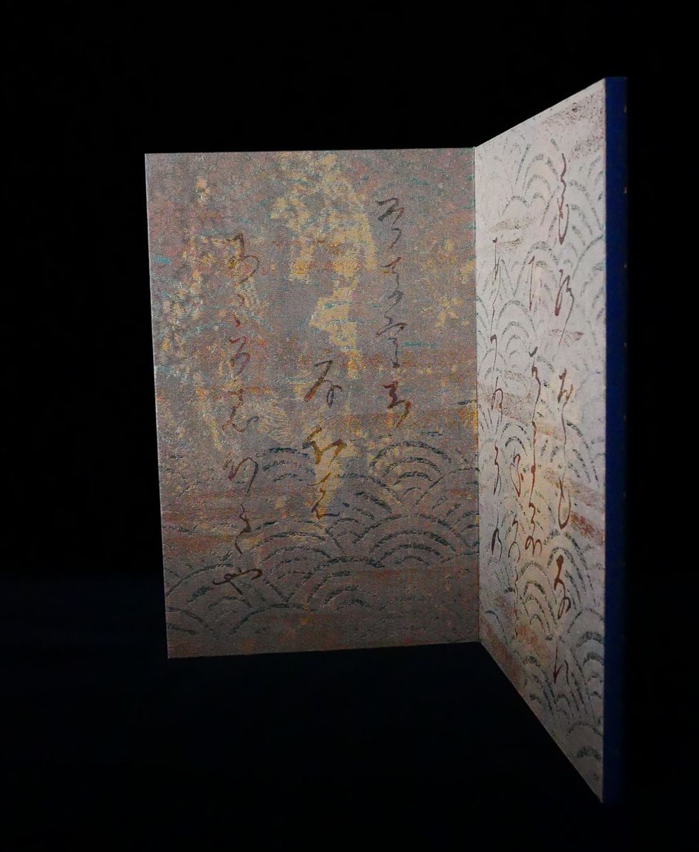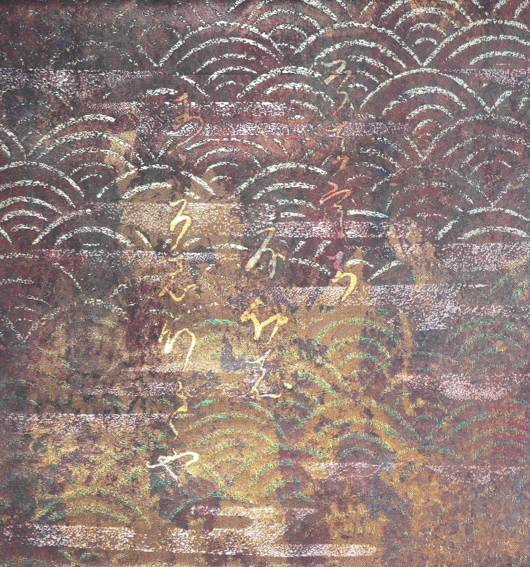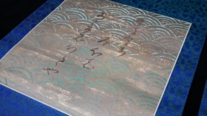 Using genuine silver leaf pearl powder patterned Hikibaku, we have expressed a scene from Chapter Seven of “The Tale of Genji,” the “Maple Feast,” where Genji’s poem of a love letter to Fujitsubo is depicted: “In my sorrow, although I cannot dance, I waved my sleeve. Did you notice my feelings?”