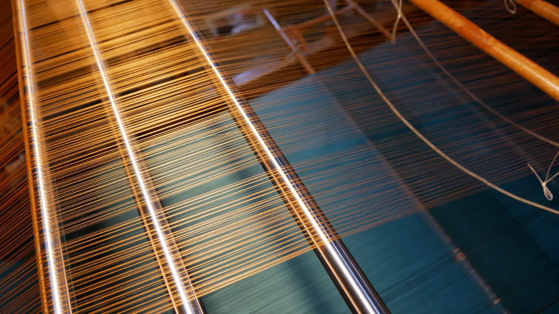 In our case, the standard warp thread thickness is “21/2 twin (21 denier, 2-ply)” or “21/3 twin (21 denier, 3-ply),” but the Karami threads are “21 single threads (21 denier, 1-ply) of raw silk (unrefined),” which are half or a third the thickness of regular warp threads. This technique allows the creation of textiles that do not diminish the brilliance of the gold.