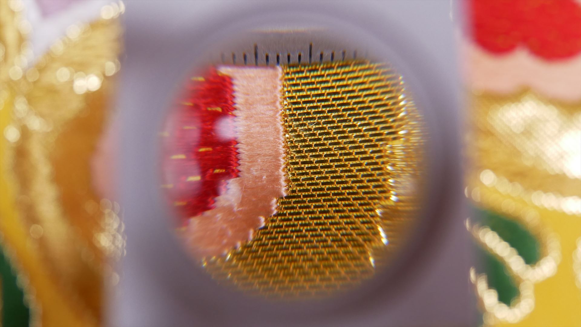 As the name suggests, Nishijin brocade Kinran is characterised by its golden colour, and the “red Karami” technique was devised to beautifully express this gold. This method uses very fine red threads to secure gold foil and gold threads.