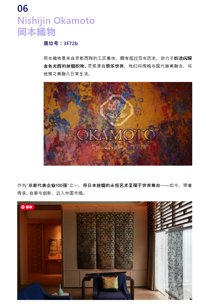 岡本織物是来自京都西阵的工匠集体,拥有超过百年历史,致力于织造闪耀金色光辉的丝绸织物。灵感源自极乐世界,我们将传统与现代审美融合,将优雅之美融入日常生活。作为“京都代表企业100强”之一,我们自豪地将日本丝绸的永恒艺术呈现于世界舞台——如今,带着传承、自豪与创新,迈入中国市场