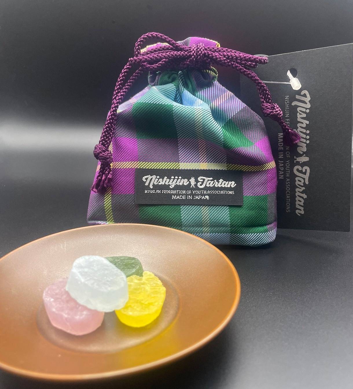 This time, a collaboration between Nishijin Textile Industry Association, Nishijin Union Youth Association members, Nishijin octed, and Nishijin Tartan has resulted in the creation of a gift set called “Nishijin Tartan Bag & Kohakuto (Narumi Mochi).”