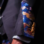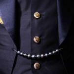 • 羽織紐をイメージしたスーツの留め具は奄美大島の真珠。