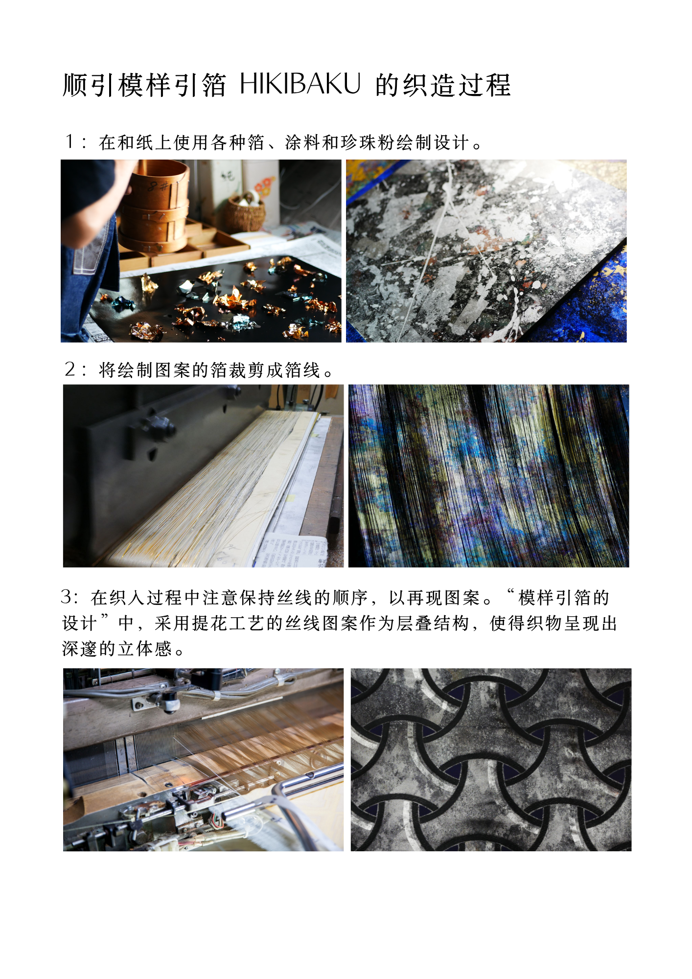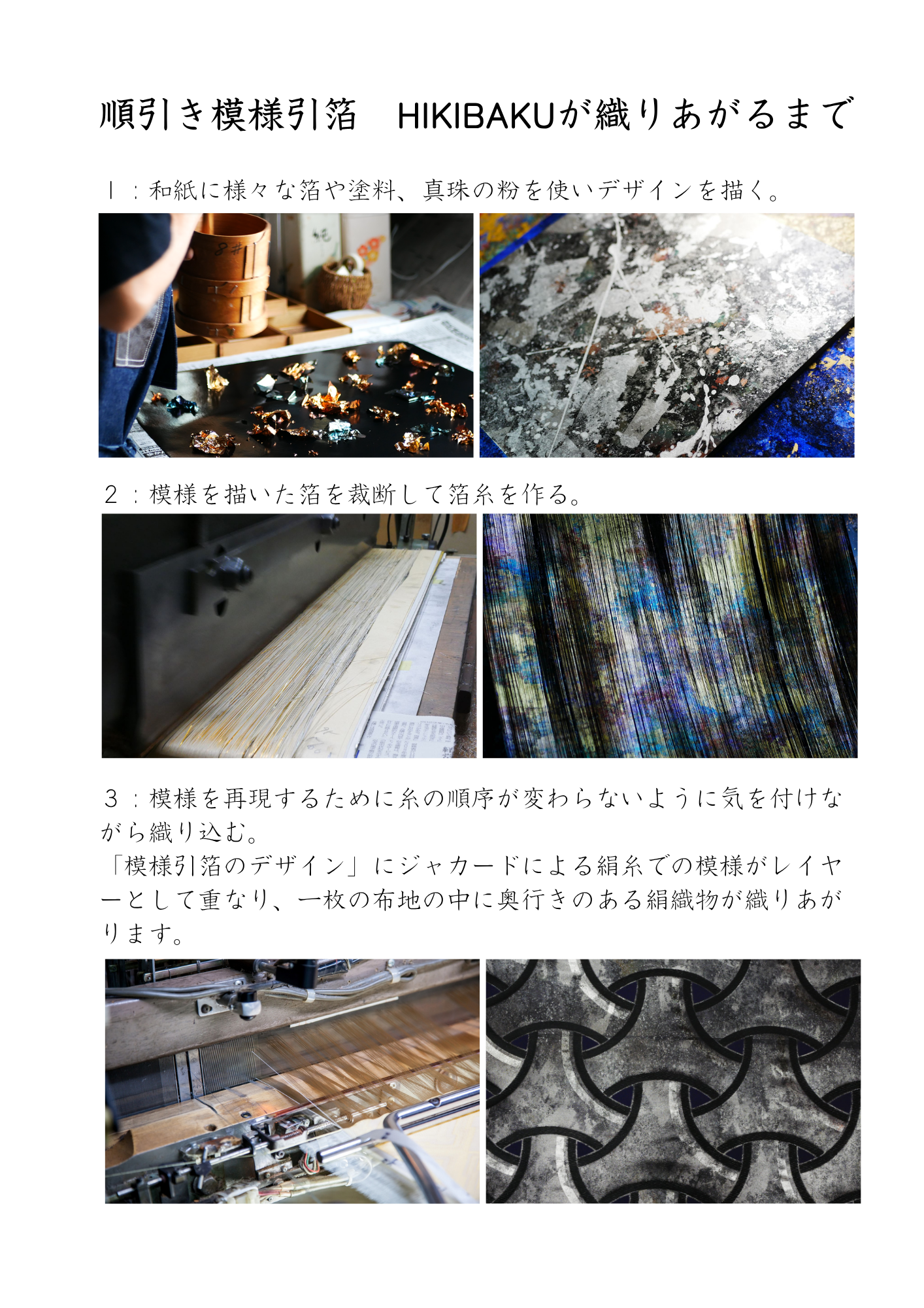 以下がその時の説明文「順引き模様引箔 HIKIBAKUが織りあがるまで」です。これを読んでくださる方、わからないことがありましたら、お問い合わせ、SNSからで良いので質問をしてください。どこが分からないのかが製造しているものにはわからないのです。