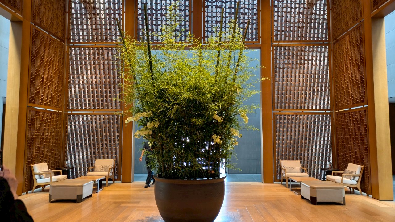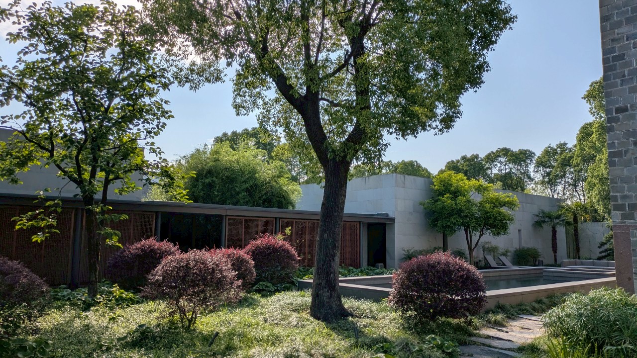 下の動画はアマン上海のエントランスです。広々とした芝生に楠が点在し、落ち着く空間となっています。