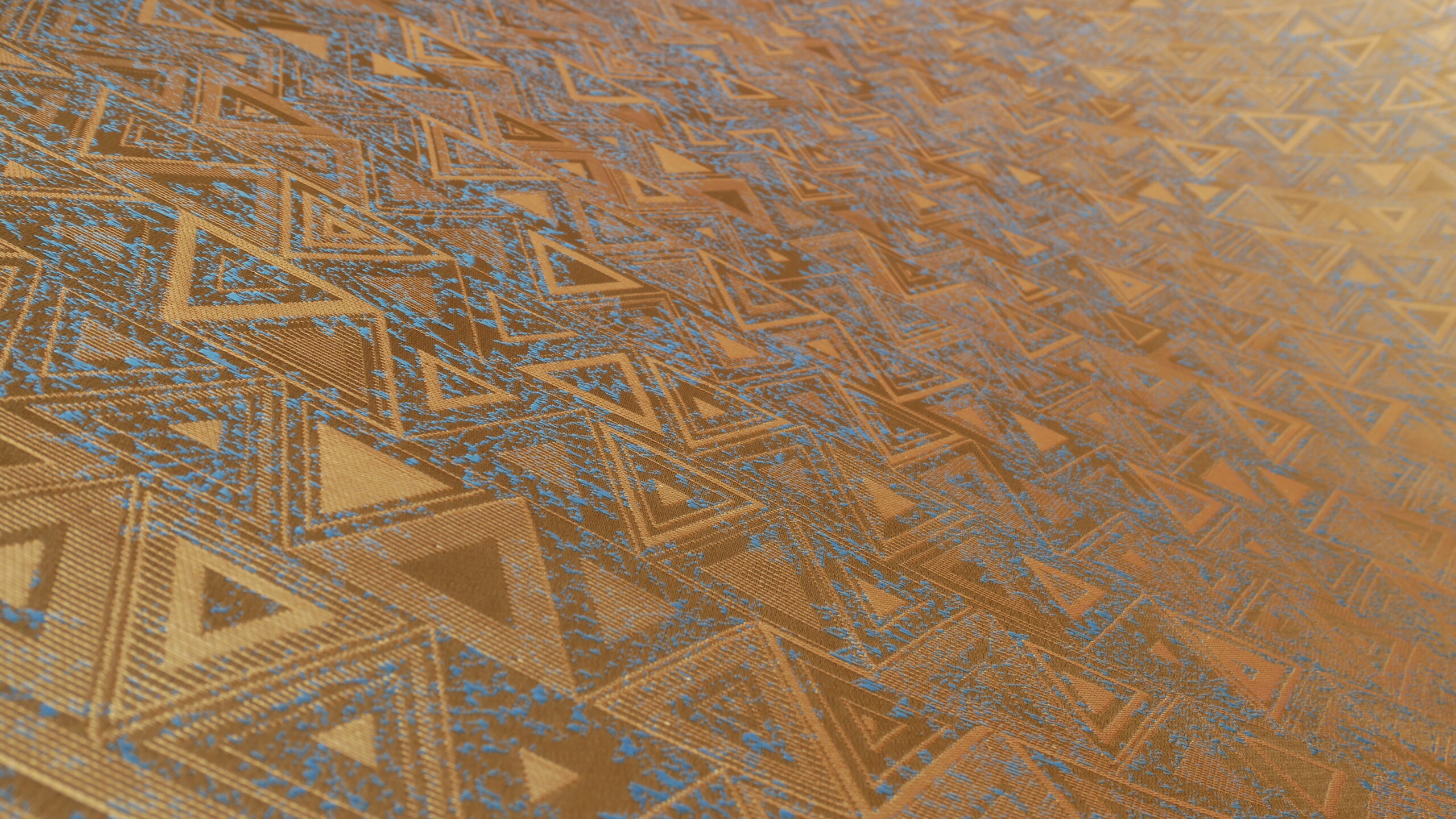 リヤドのマスマク城を訪れた夏の夜、沢山のヤシの木と三角形を見ました。リヤドに生まれ育った人たちから、リヤドの人たちが三角のデザインを愛する話も聞きました。その思い出と京都の石垣をイメージして描いたデザインを西陣織で現わしました。