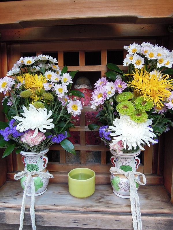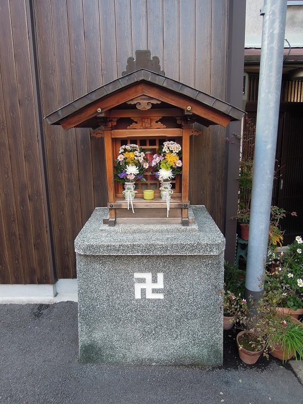 その一松町にいはったお地蔵様です。「卍」の台座に木造りの祠。