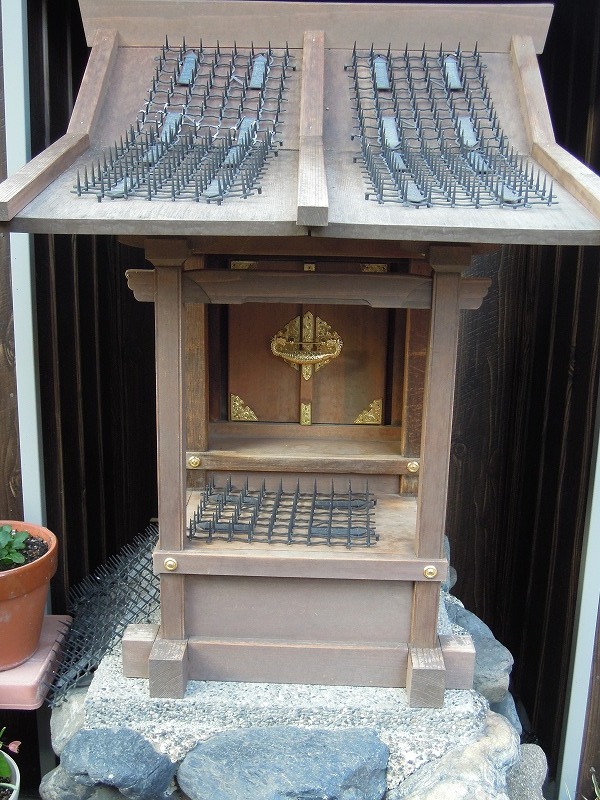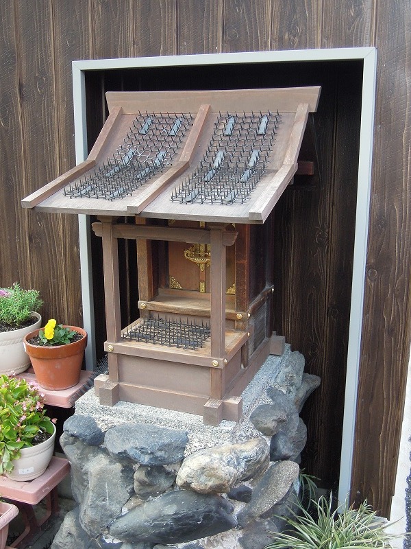 上のお地蔵様の近くにあった家の壁にめり込むように祠が立っていました。祠自体は割りと最近に新調しはった感じです。ここらへんは野良猫?が沢山います。そのネコ避けかしら・・・。