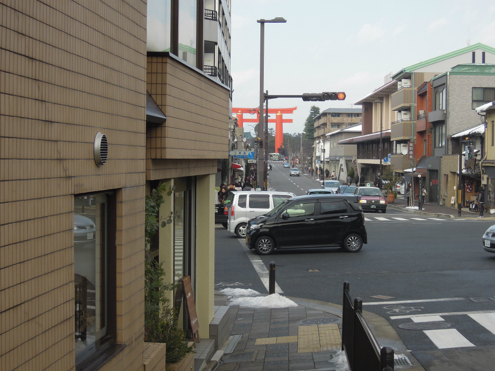 良い眺めですよ。平安神宮の大鳥居をよい感じに眺める事が出来ます。年始という事もあって神宮道は沢山の人が歩いてはりました。