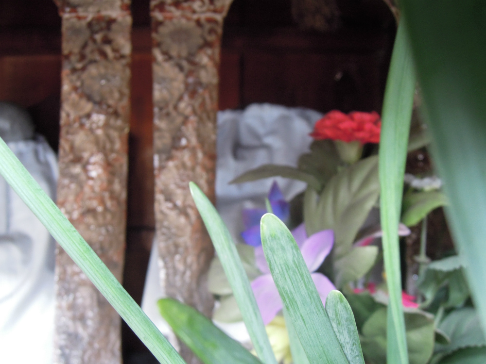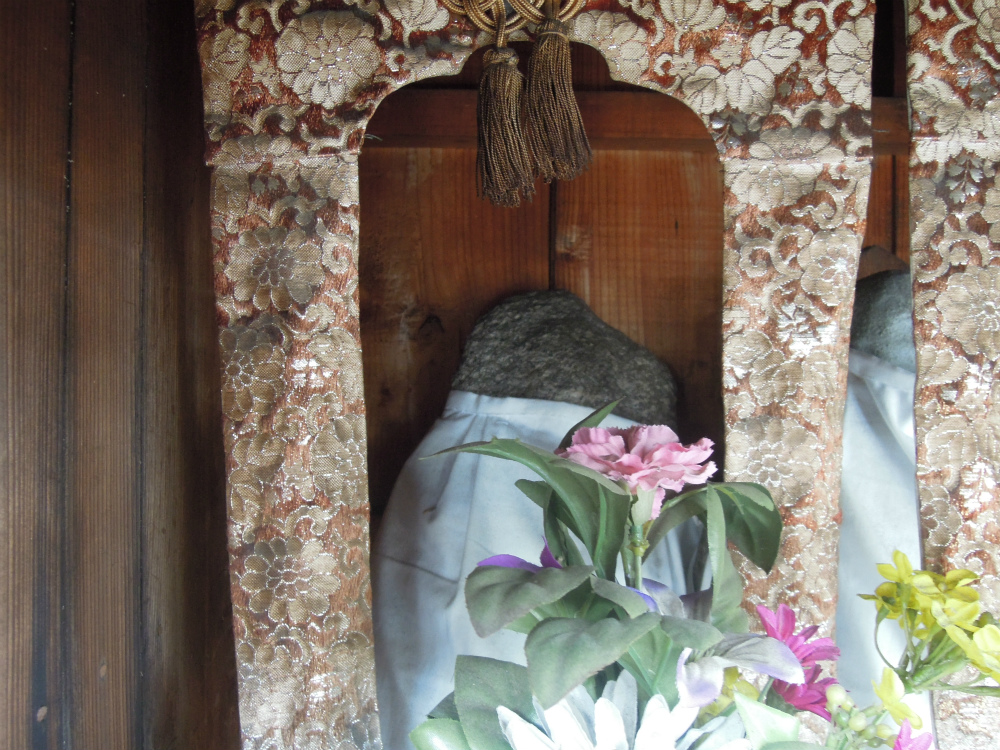 花にピントが合ってしまい中のお地蔵さんも金襴もぼけぼけになってしまいました。