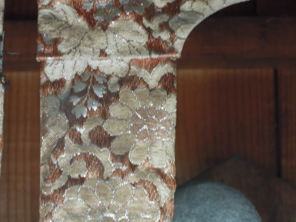 菊唐草の金襴地。かなり年季が入っていますね。朱地?茶色地?