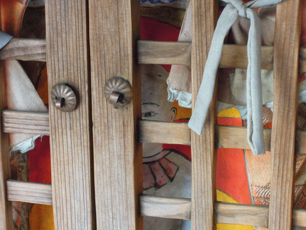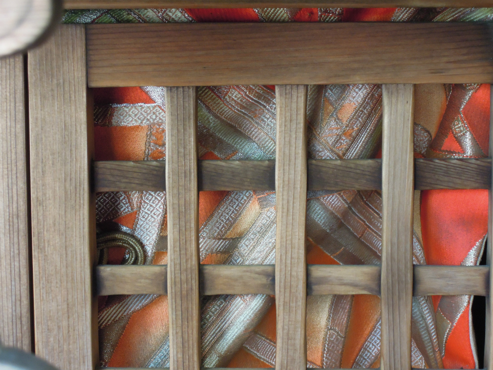 大胆な格子柄がメインの金襴?それとも銀襴?褪色して銀になっているのかしら?朱地の金襴地です。