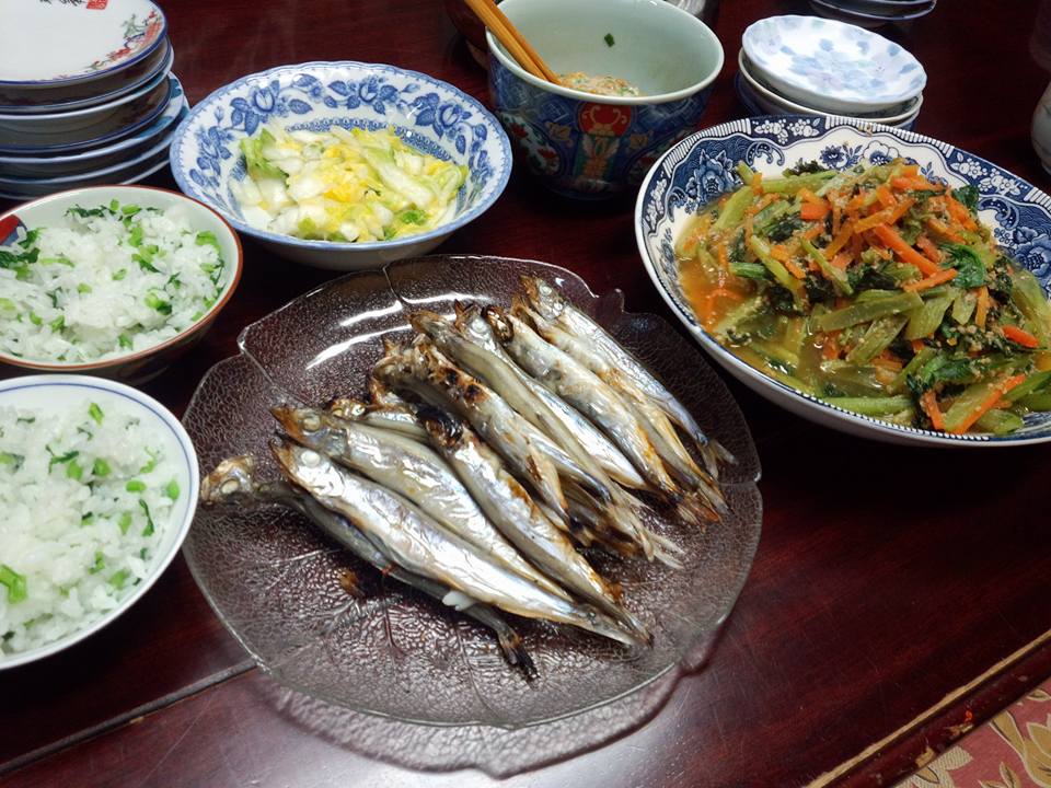 今日の織屋の賄いは、子持ちシシャモをひたすら焼いて、小松菜のおひたし。おひたしが汁だくになってしまったのはご愛嬌で。蕪の葉の菜飯でした。