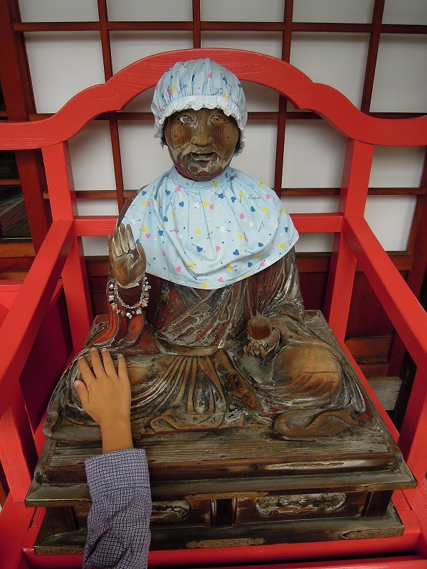まあ、びんづるさんもやたら可愛いお帽子と前掛けをさせてもろうて、良かったなあ。自分の痛いところを撫でておきましょう。