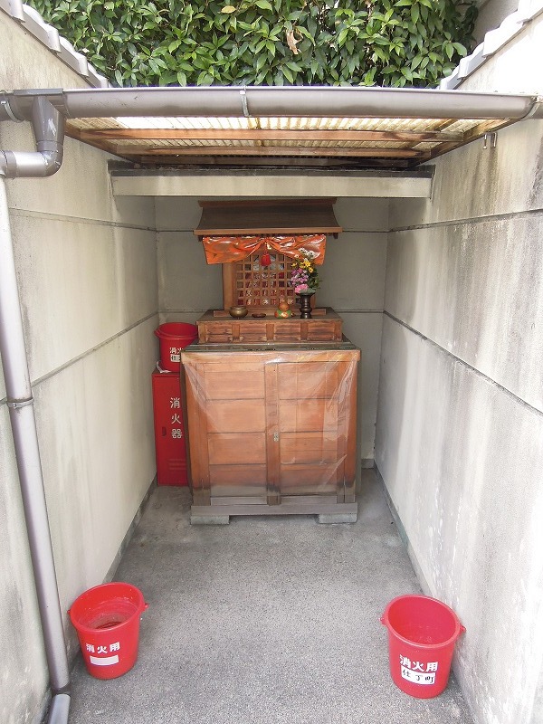 このお地蔵さんの受け持ちはホテルなのかしら?それともこの北隣のおうちのものなのかしら?でも中々の敷地の広さで、屋根もばっちり。土台もビニールがかけられて汚れないように注意してもらっています。