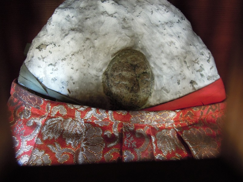 流水紋様の戸帳にお地蔵さんは菊桐唐草のおべべを着てはります。
