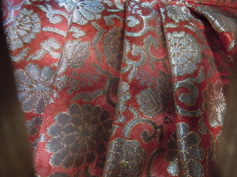 この西陣織だと思われる金襴は「菊」「桐」のちらばった唐草紋様で西陣織屋では「菊桐唐草」と呼ぶ紋様です。伝統的な定番です。