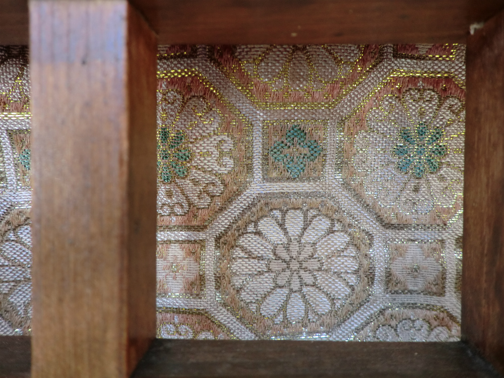 金襴は蜀甲華紋。たぶん朱子地(この場合は朱子色ということ)です。そして地組織は綾地だと思います。経年劣化からなのか、ものすごく荒く見えますね。