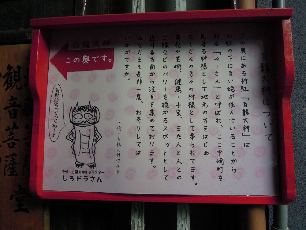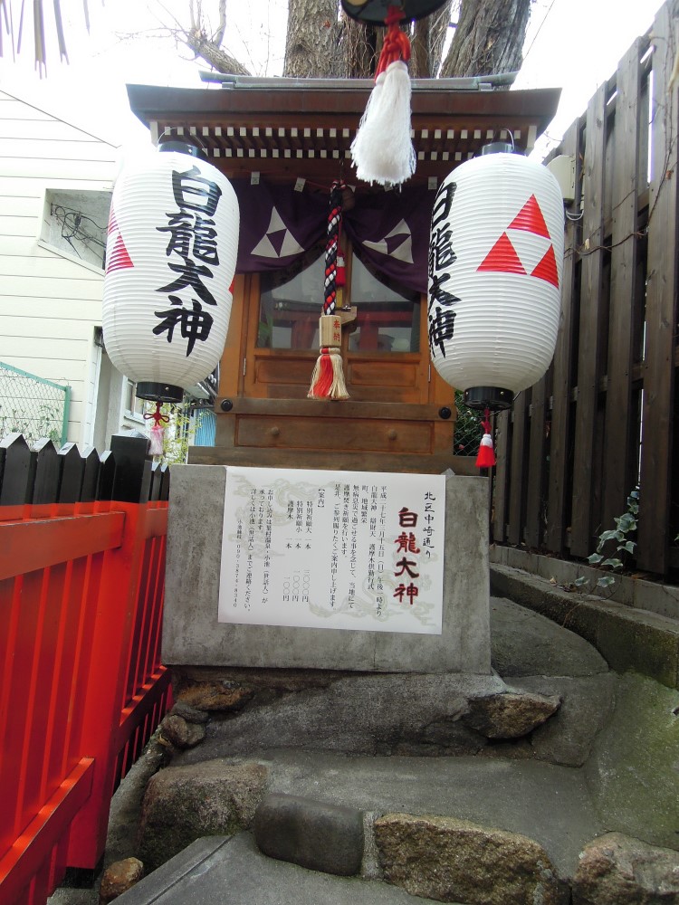 この奥にある神社「白龍大神」はお社の下に白い蛇が住んでいることから別名「みーさん」と呼ばれ、ここ中崎町を見守る神様として地元の方を始め沢山の方々の神様として奉られています。商売や芸術、健康、子宝、また人と人のご縁をなどのパワーを授かるスポットとして近年各方面から注目を集めております。皆様も是非一度、お参りしてはいかがですか?