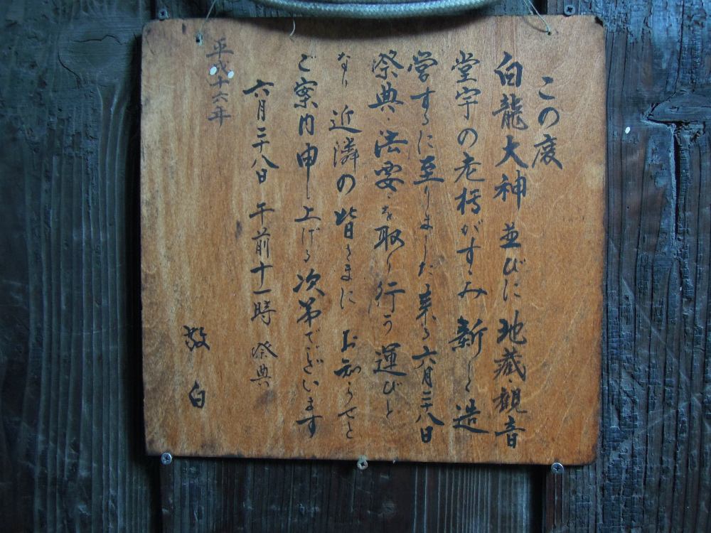 この度、白龍大神ならびに地蔵観音堂宇の老朽が進み新しく造営するにいたりました。来る6月28日 祭典・法要を取り行う運びとなり近隣の皆様にお知らせとご案内を申し上げる次第でございます。6月28日 午前11時祭典 平成16年