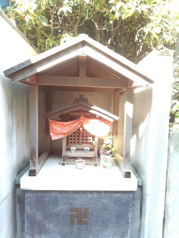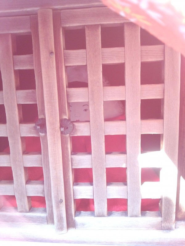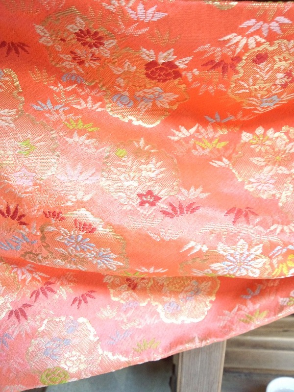 祠の前にかかる金襴地。笹に桔梗の小布です。金襴というか人形地かな。