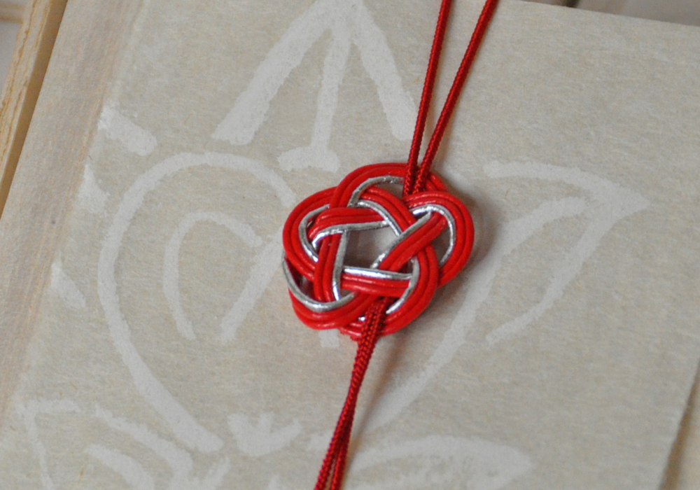 絹の紐を結ぶ際は結び目に水をつけると堅く締まりほどけにくくなります。紐にテンションをかけると形状記憶効果は良く解ります。
