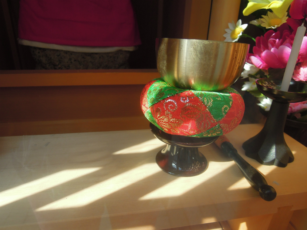 見つけた金襴地は「おりんのりん布団」の金襴地。お地蔵さんの事ばかり書いているようですが、私は金襴地を織る「岡本織物」の社員です。金襴地の事を調べたり、市井で探したりしております。緑地の菊唐草に赤地の菊唐草で「りん布団」です。