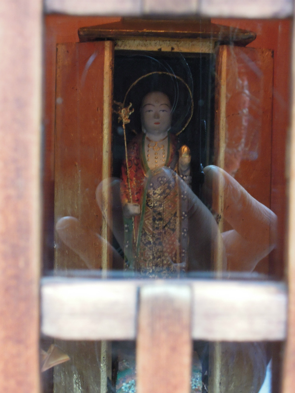 見返ってはいはりませんが、綺麗な袈裟をまとったお地蔵さんです。後光も錫杖も宝珠もきんきら。お顔も可愛らしい。