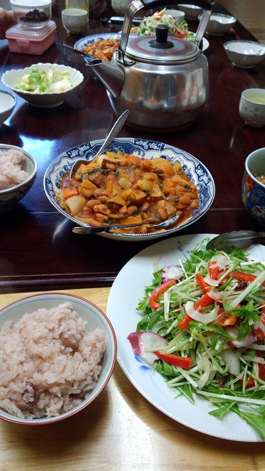 今日の西陣織屋の賄い(おばんざい)は、金時豆と野菜、厚切ベーコンの