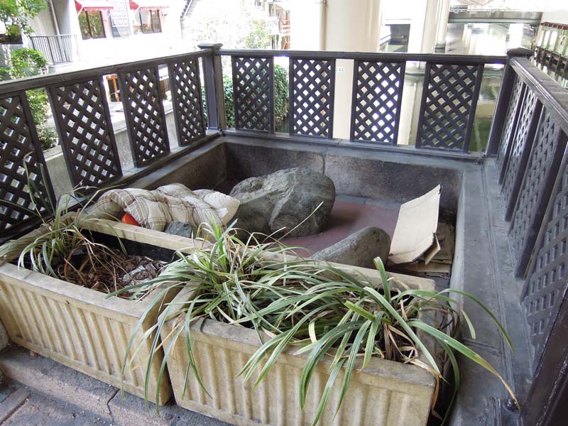 橋から川を見渡せるようにバルコニーがつけられていたんだけど、上に高速道路は通ってしまうし、空は見えなくなり川は濁って見てもつまらなくなり、ここには誰も立ったりしなくなって人が住んだりしないように植木鉢や石を置いたけれど、その隙を縫って人が寝てしまう・・・。