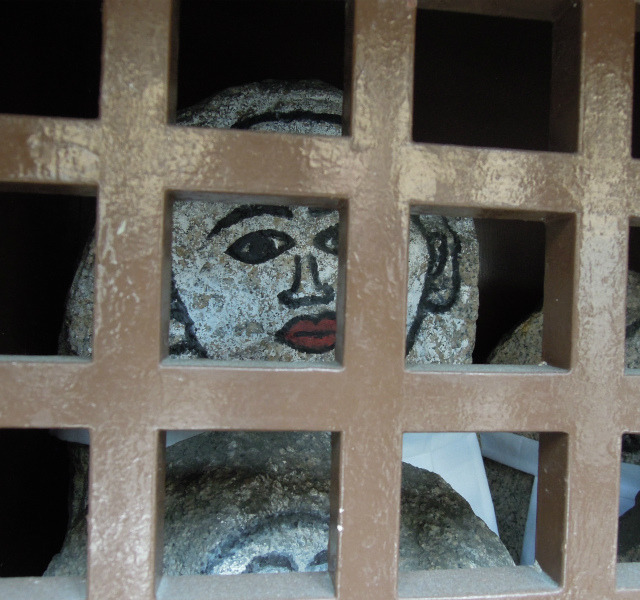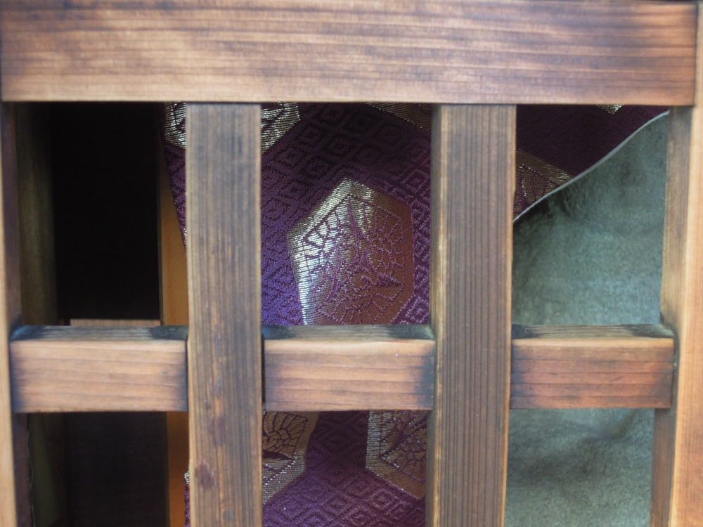 見つけた金襴は紫地の小菱地紋亀甲鶴紋。でしょうか。亀甲の中に鶴が描かれていると思うのですが・・・。右のほうにうっすらと表情の見えるお地蔵さんがいはります。