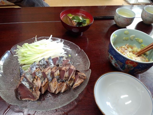 今日の織屋の賄は、かつおのタタキと鰹のぶつ切り汁。むこうにぽつんと寂しい感じなのが汁物でございます。