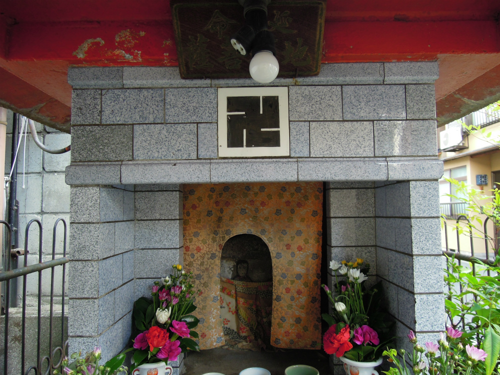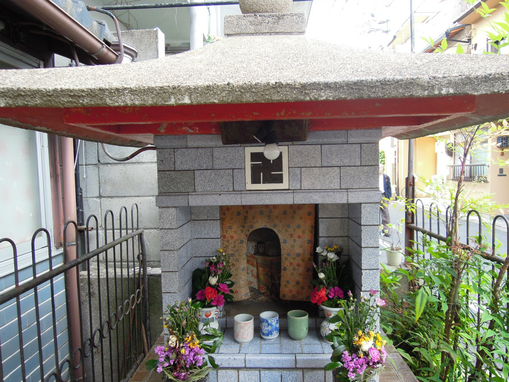 タイル張りの土台に石とタイル貼りの祠、コンクリートの屋根。ん?屋根は石かな、コンクリートかな。中が赤く塗られています。