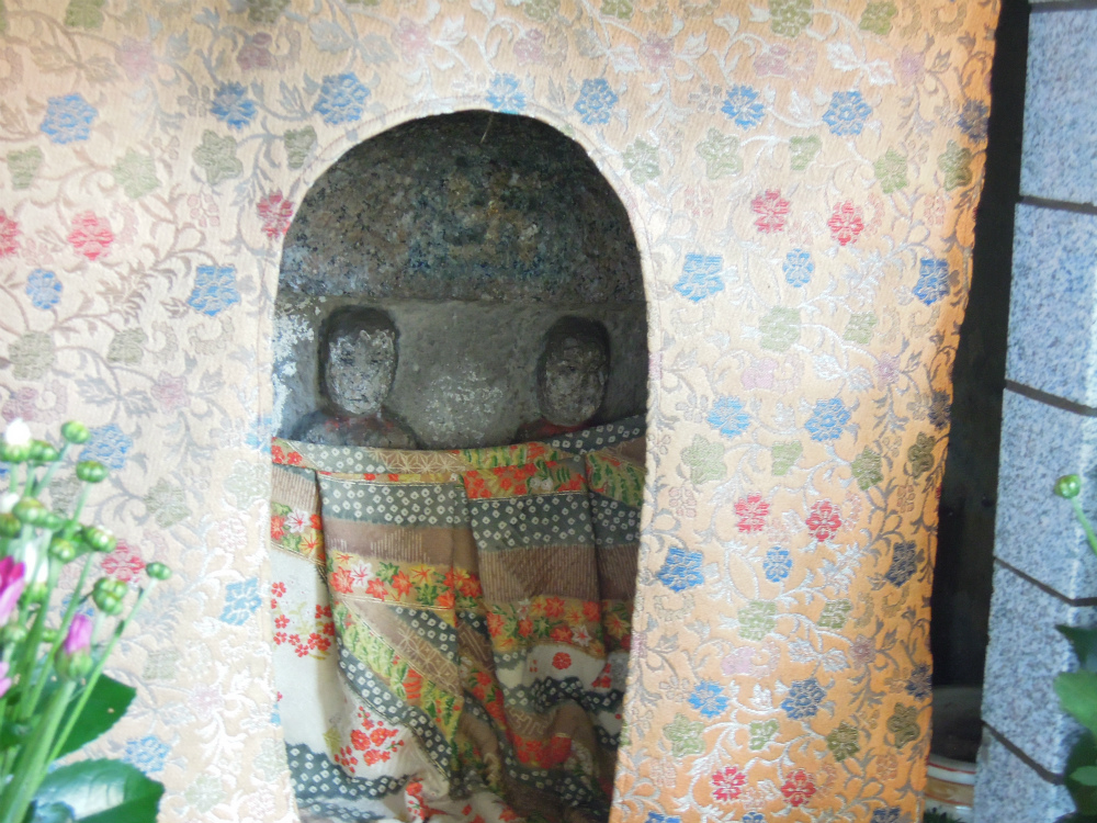 延命地蔵菩薩が祀られていることは確かですね。戸帳をよけるわけにも行かず拝見できたのは双子地蔵さん。着物地か襦袢かと思うおべべがかけられています。