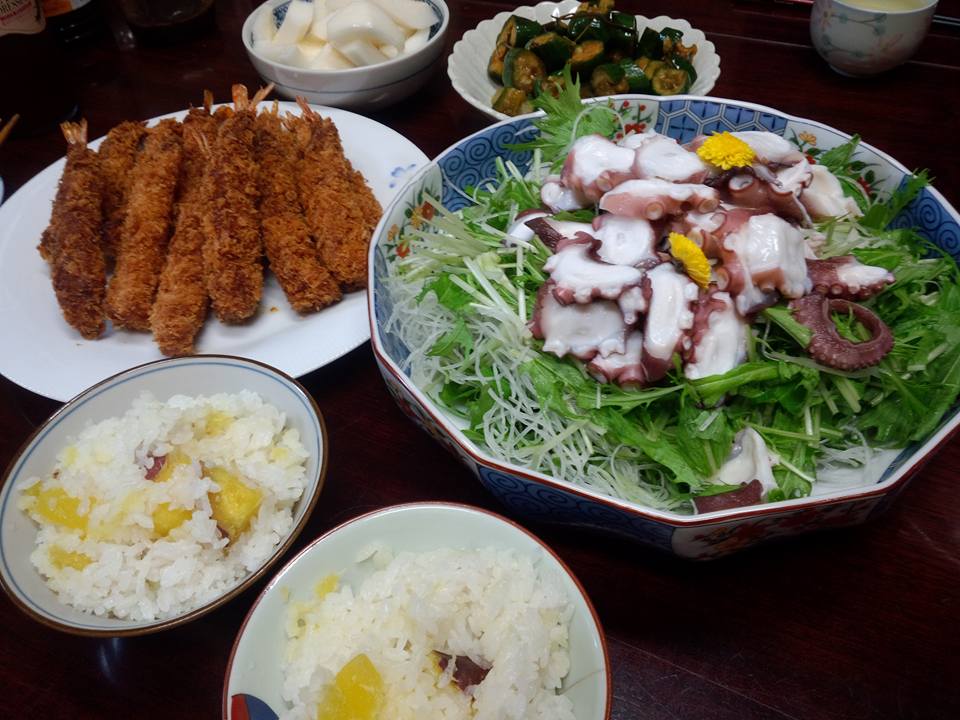 今日の織屋のまかないは、さつまいもに生姜をちょっと利かせた炊き込みご飯、エビフライ、蛸と水菜のサラダ等々でございました。