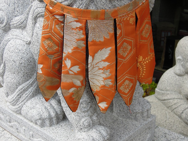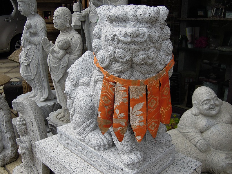 今回は期待せずに歩いていたときに金襴を発見しました。ぶらぶら散歩していると・・・「ん?あのきらきらの布は・・・」と近づくと金襴でした。こんな所に金襴が!東堀川通りにある石屋さん。芳村石材店「石茂」さん。石屋さんっていったん製作した石彫に風情を出すために雨ざらしにしたりしてはりますよね。そのように玄関前においてあった狛犬さんに金襴のおべべが掛かっていました。