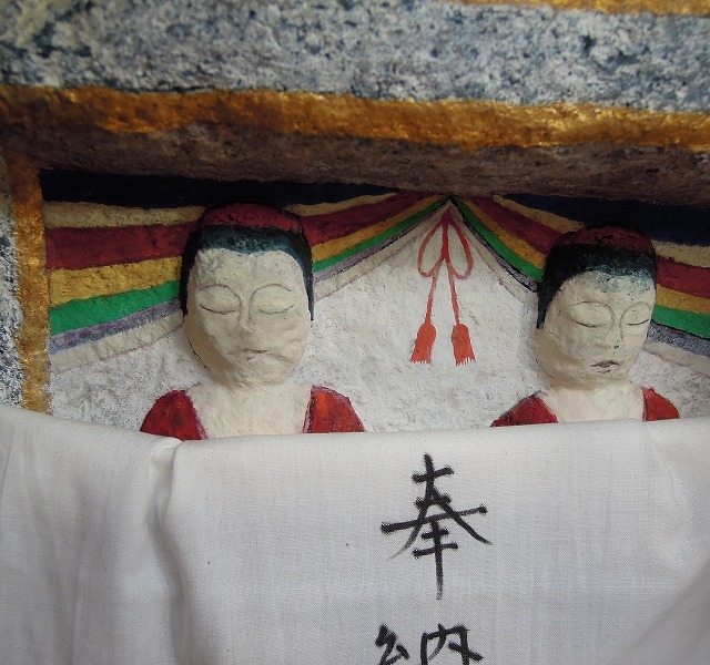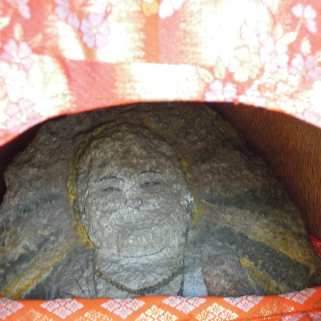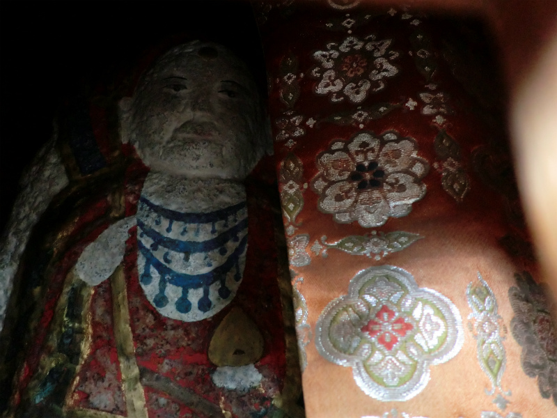戸帳の向こうにお地蔵さん。暗いから・・・ちょっと怖く見えますが、左手に宝珠、右手に錫杖。冷静なお顔立ちです。首飾りが沢山。