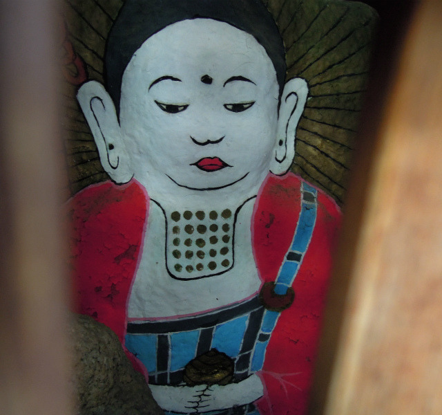 お地蔵さんって地蔵菩薩という本名があります。サンスクリット語ではクシティ・ガルバ(क्षितिघर्भ )と言います。「クシティ」は「大地」を指し、ガルバは「胎内」「子宮」を指します。「胎内」は物を収める所、子宮は正に命が納めていた場所、という意訳で「蔵」が当てはめられて、地蔵、となったようです。お地蔵さんの像としての特徴は一般には剃髪した僧侶の姿でおでこにあるぽち(白毫)があり、袈裟を着てはります。アクセササリーは最大でもネックレスくらいしか身につけていません。左手に如意宝珠、右手に錫杖をもつか印を結んではります。今日のお地蔵さんは左手に宝珠、右手に錫杖ですね。