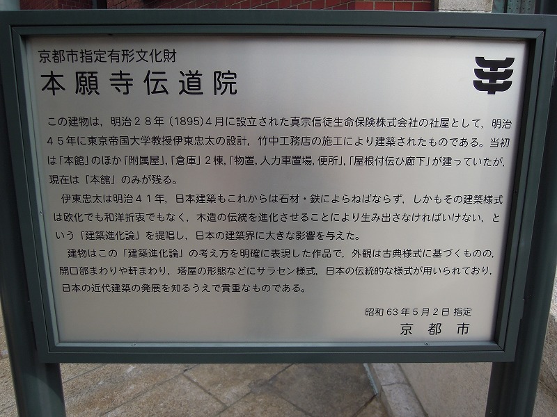 建物はこの「建築進化論」の考え方を明確に表現した作品で、外観は古典様式基づくものの、開口部まわりや軒まわり、塔屋の形態などにサラセン洋式、日本の伝統的な洋式が用いられており、日本の近代建築の発展を知るうえで貴重なものである。>昭和63年5月2日 指定 京都市