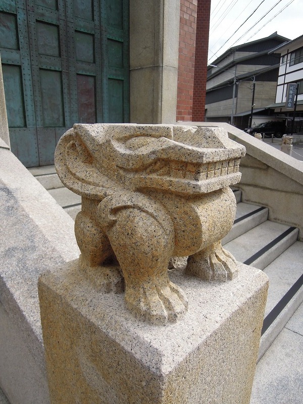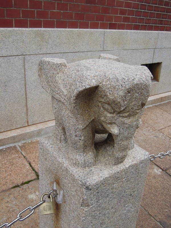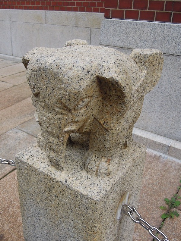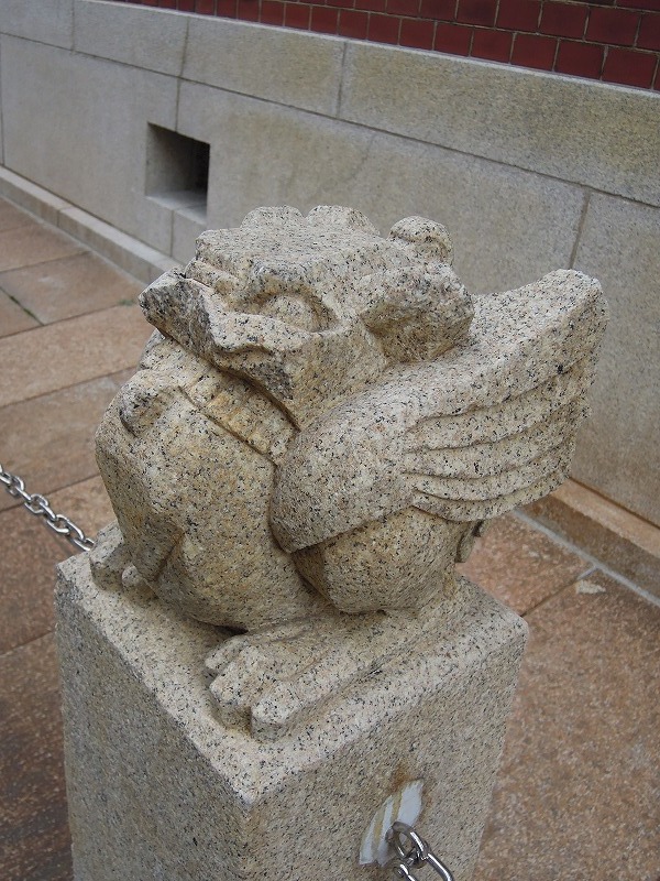 ん?これは・・?変な動物が。車止めとして空想上の動物・怪獣の像の石柱が並んでいます。