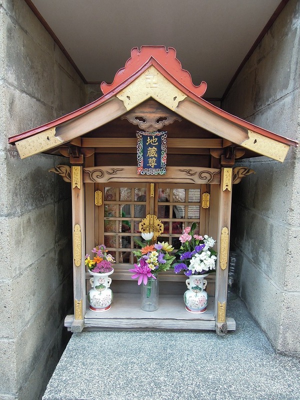 さすが仏具屋さん街。お地蔵さんも仏具は揃っていますね。ブロックに囲まれた祠。蝶番なども素敵。